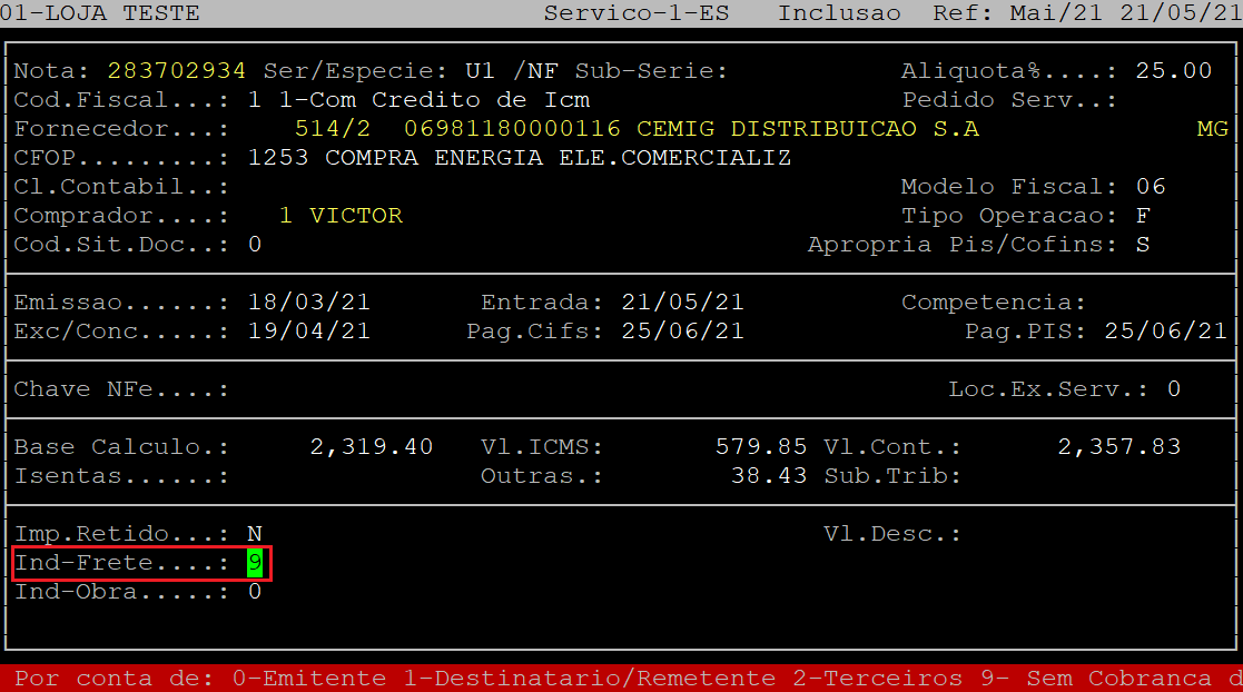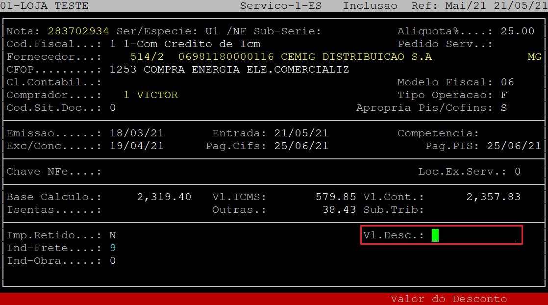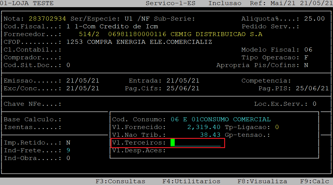 No campo Vl.Terceiros, aperte a tecla Enter para prosseguir para o próximo campo.