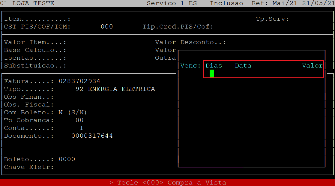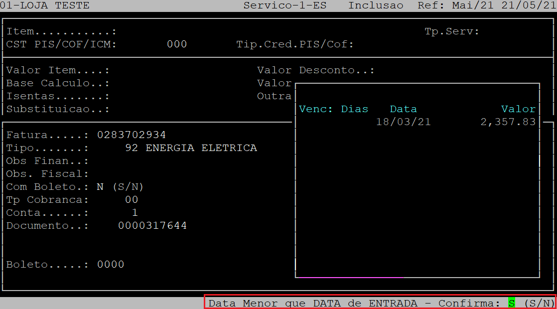 Em casos em que a data de vencimento é menor que a data de entrada o sistema exibirá a pergunta " Data Menor que Data de Entrada - Confirma: ", no qual deverá apertar a tecla S para confirmar os dados financeiros, conforme o exemplo abaixo.
