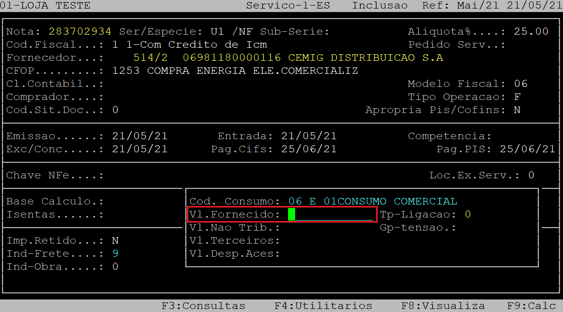 Depois, o sistema abrirá a janela para preenchimento dos dados de consumo da nota fiscal. Inicialmente o cursor do teclado se posicionará no campo Vl.Fornecido. Informe o valor da energia elétrica sem encargos, ou seja, valor da nota menos os encargos e serviços (exemplo: energia elétrica kWh sem taxa de iluminação pública, multa e juros).