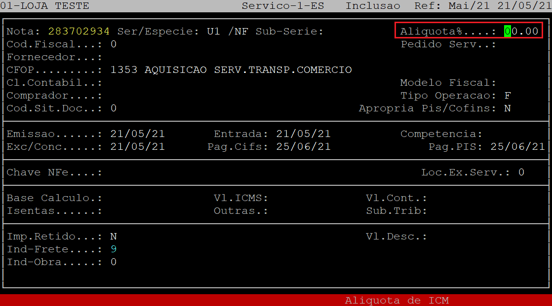 No campo Aliquota%, informe a alíquota de ICMS do documento fiscal e, aperte a tecla Enter. Se não existir, apenas aperte a tecla Enter para prosseguir para o próximo campo.