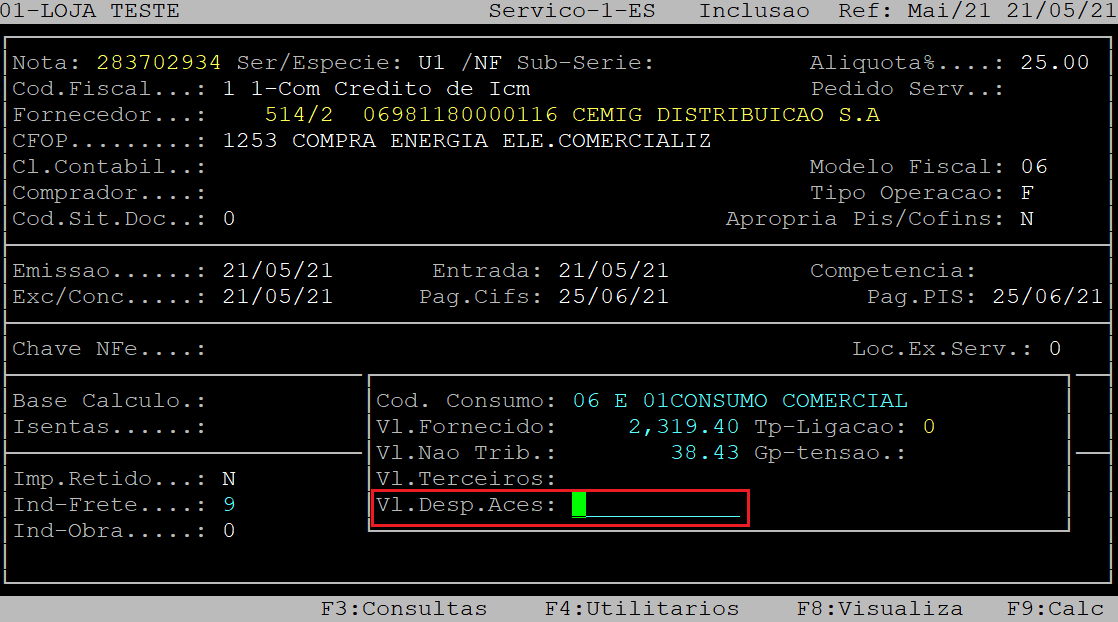 No campo Vl.Desp.Aces, aperte a tecla Enter para prosseguir para o próximo campo.