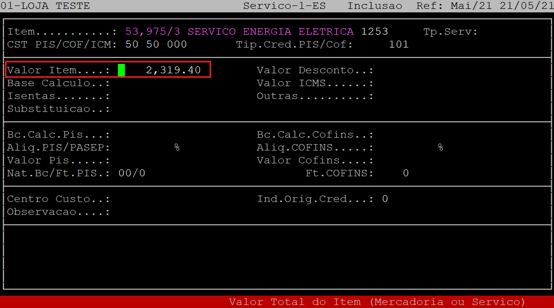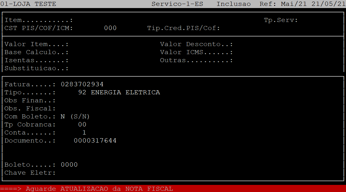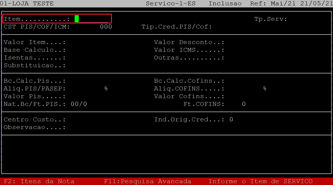 Em seguida, o sistema retornará o cursor para o campo Item, no qual poderá lançar mais produtos de serviço se houver na nota. Caso não tenha, aperte a tecla Esc.