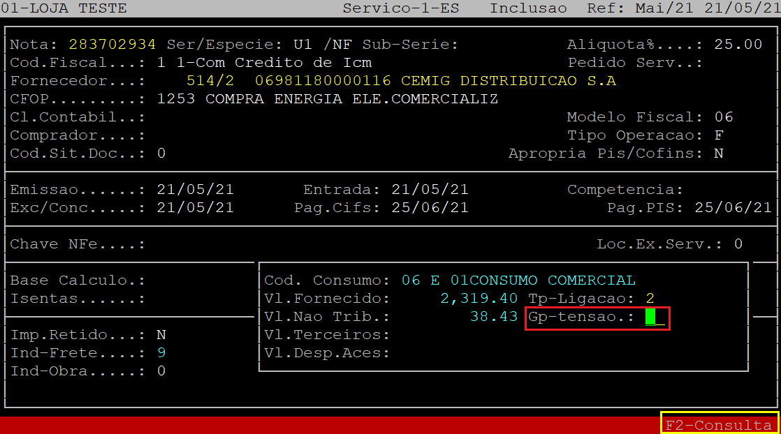 No campo Gp-tensao, informe o código referente a faixa de valor de Kw consumidos, conforme referenciado na nota. Para verificar as opções, aperte a tecla F2, depois aperte a tecla Esc para sair da tela de consulta e, em seguida informe o código correspondente.