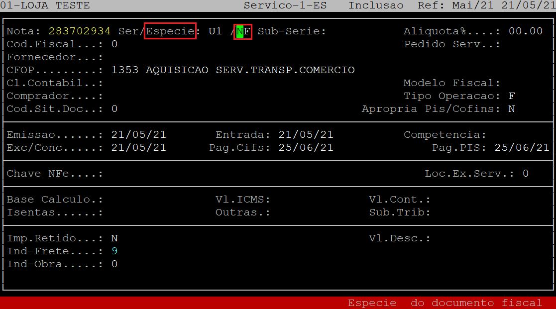 No campo Especie, aperte a tecla Enter para manter a espécie do documento fiscal como NF.