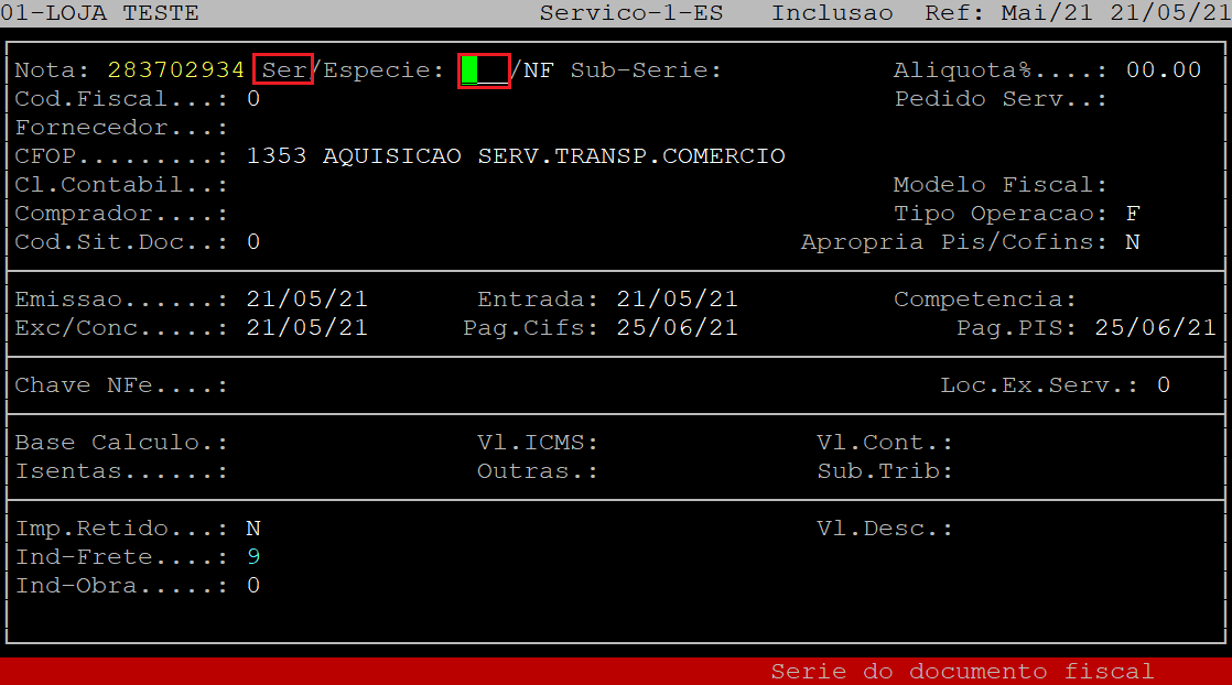 No campo Ser, informe a série da nota fiscal. Se não existir, apenas aperte a tecla Enter para prosseguir para o próximo campo.