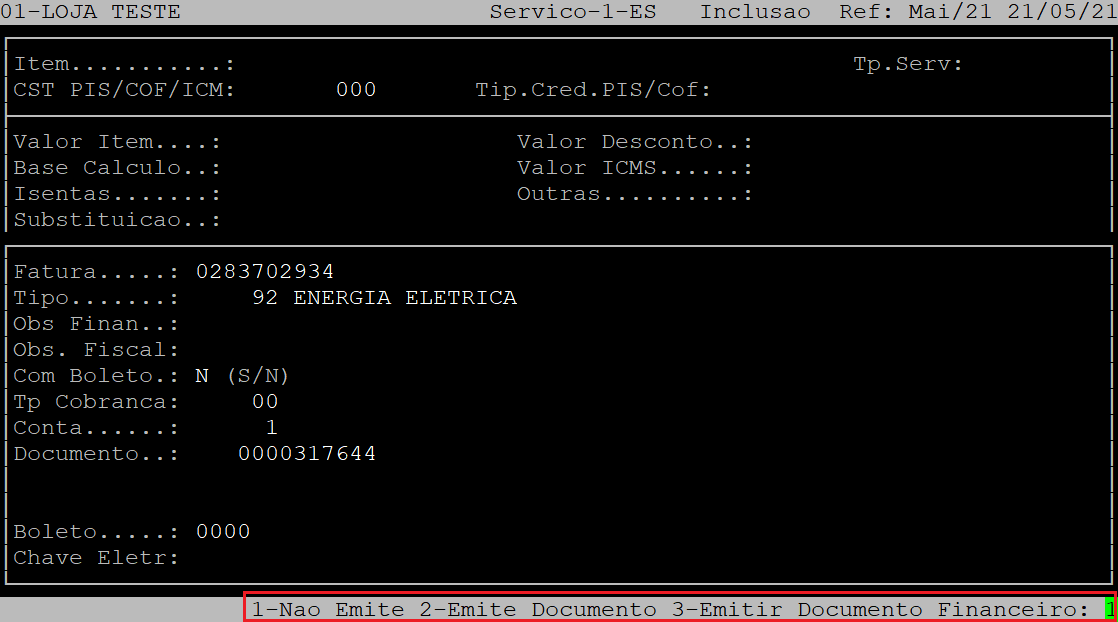 Logo após, escolha a opção de emissão do documento digitando o número correspondente, sendo: 1 - não emitir, 2 - emitir, ou 3 - emitir documento financeiro.