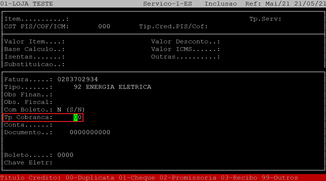 No campo Tp Cobrana, informe o código correspondente ao tipo de cobrança da nota fiscal, sendo: 00 - duplicata, 01 - cheque, 02 - promissória, 03 - recibo, ou 99 - outros pagamentos.