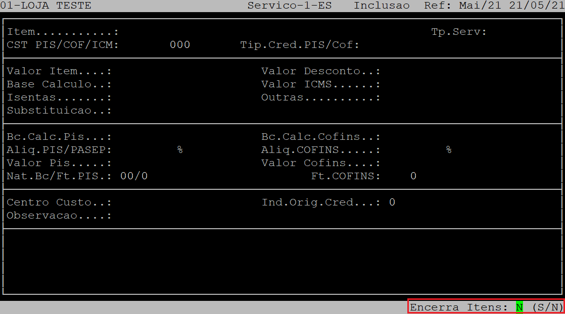 Após apertar a tecla Esc, o sistema exibirá a pergunta " Encerra Itens? ", no qual deverá informar a letra S para sim, ou N para não.