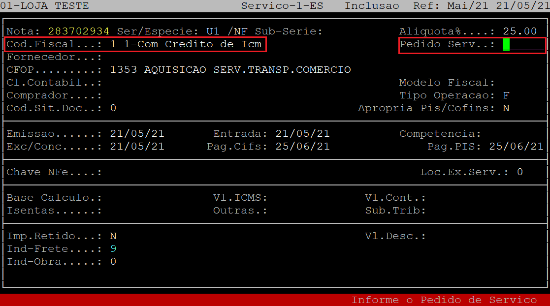 Caso seja informado a alíquota de ICMS no campo Aliquota% o campo Cod.Fiscal será preenchido automaticamente com o Código Fiscal de Operação 1 - com crédito de ICM. Sendo assim, o cursor do teclado será posicionado no campo Pedido Serv, no qual deverá apertar a tecla Enter para prosseguir para o próximo campo.