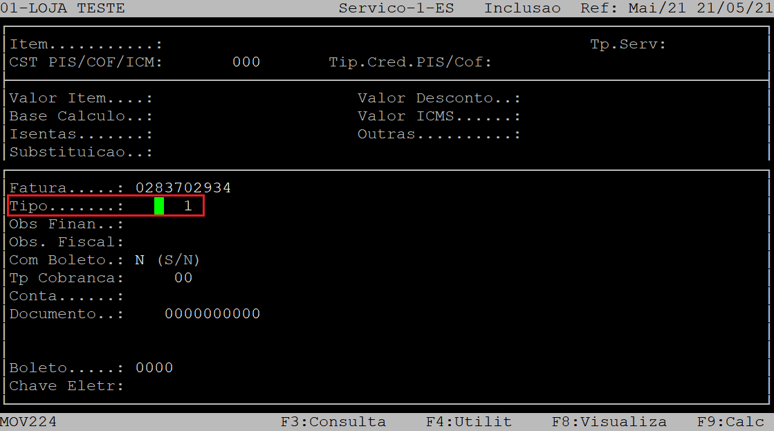 O campo Tipo Operacao, será preenchido automaticamente com a letra F, correspondente ao tipo de operação para serviço contratado.