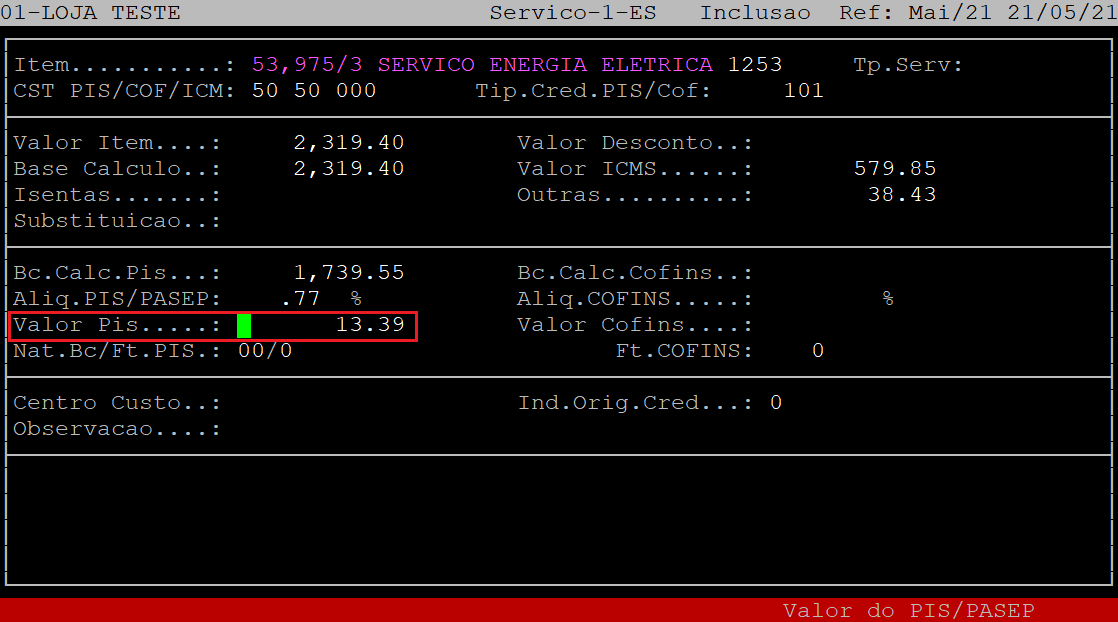 O campo Bc.Calc.Pis, será habilitado e preenchido automaticamente baseado nas informações da tela anterior, podendo ser modificado, caso necessário. Mas para que o sistema carregue essa informação, é necessário que o campo Apropria Pis/Cofins (tela anterior) esteja setado como S.