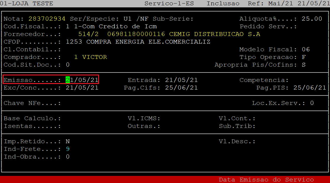 No campo Emissao, informe a data de emissão da nota fiscal (com dois dígitos para dia, mês e ano) e, aperte a tecla Enter.