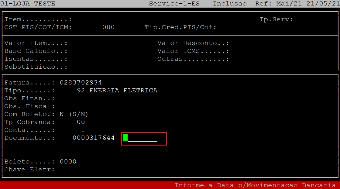 No campo à frente do campo Documento, informe a data para movimentação bancária (com dois dígitos para dia, mês e ano) e, aperte a tecla Enter. Se não desejar informar, apenas aperte a tecla Enter.