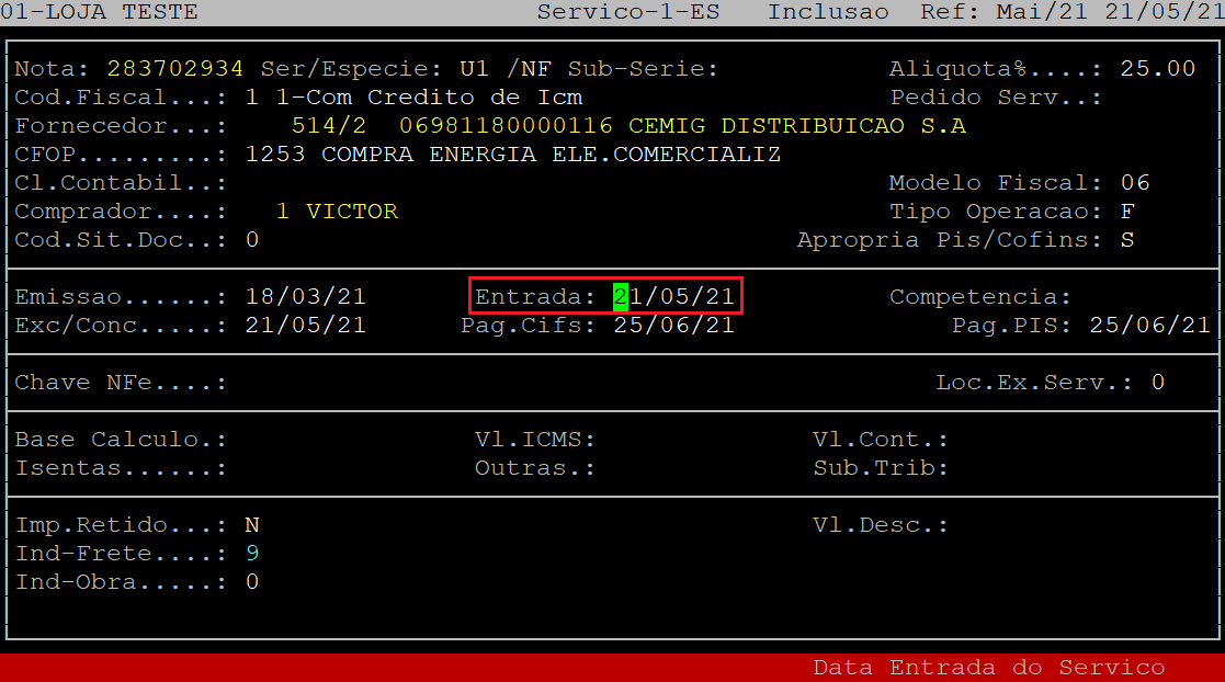 No campo Entrada, informe a data de entrada da nota fiscal (com dois dígitos para dia, mês e ano) no sistema e, aperte a tecla Enter.