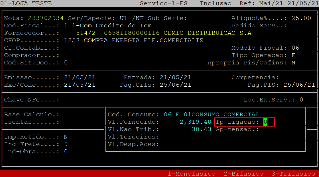 No campo Tp-Ligacao, informe o número correspondente ao tipo de fornecimento da energia elétrica, sendo: 1 - Monofásico, 2 - Bifásico, ou 3 - Trifásico.