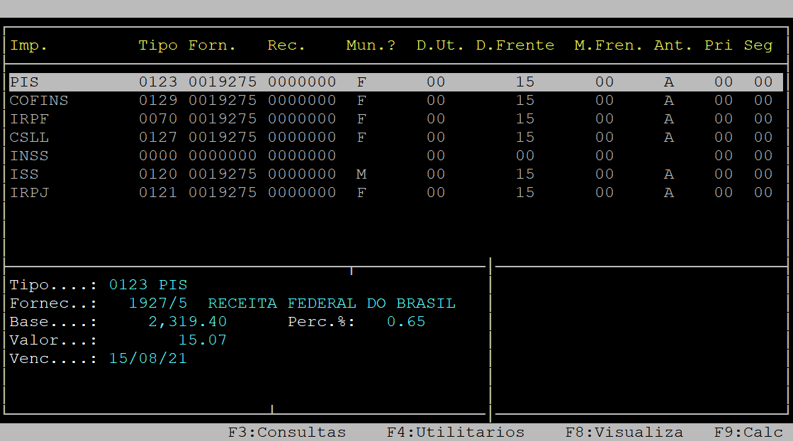 Logo após, será exibido na tela as composições de desconto de acordo com as configurações realizadas no sistema. Utilize as setas do teclado para selecionar o imposto desejado e, assim visualizar os valores no quadro localizado na parte inferior.