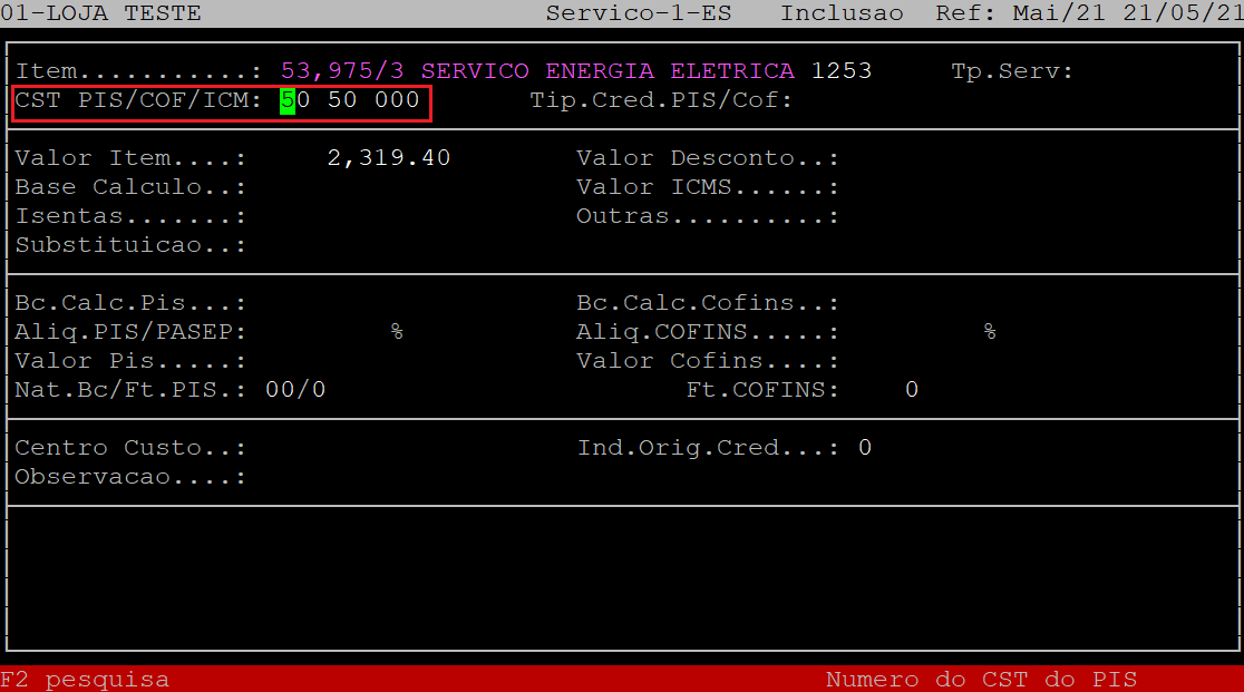 O campo CST PIS/COF/ICM será preenchido automaticamente de acordo com o cadastro de produto. Porém, se desejar alterar, no primeiro campo informe o CST de PIS (com dois dígitos), no segundo campo informe o CST COFINS (com dois dígitos) e, no terceiro campo informe o CST de ICMS (com três dígitos).