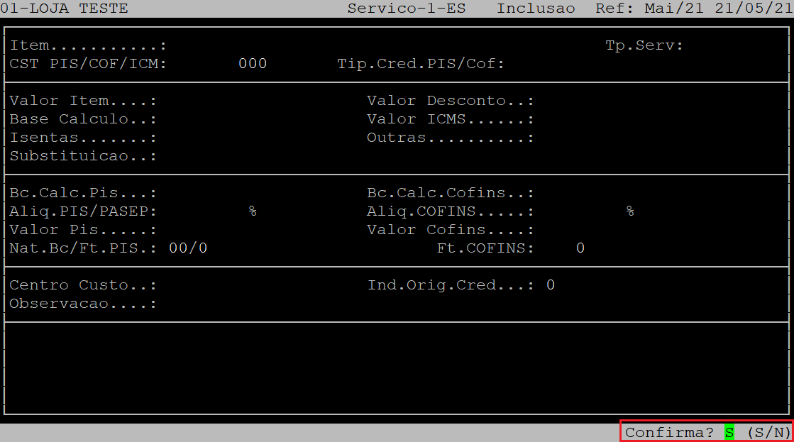 Para finalizar a nota fiscal de serviço, ao ser exibida a pergunta " Confirma? ", aperte a tecla Enter ou a letra S.