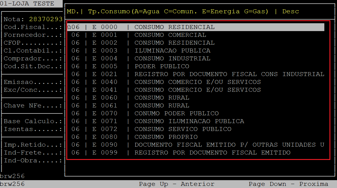 Em seguida, o sistema abrirá a janela com as opções do tipo de consumo (no caso da nota fiscal de energia elétrica). Utilize as setas do teclado para selecionar o tipo de consumo desejado e, aperte a tecla Enter para confirmá-lo.