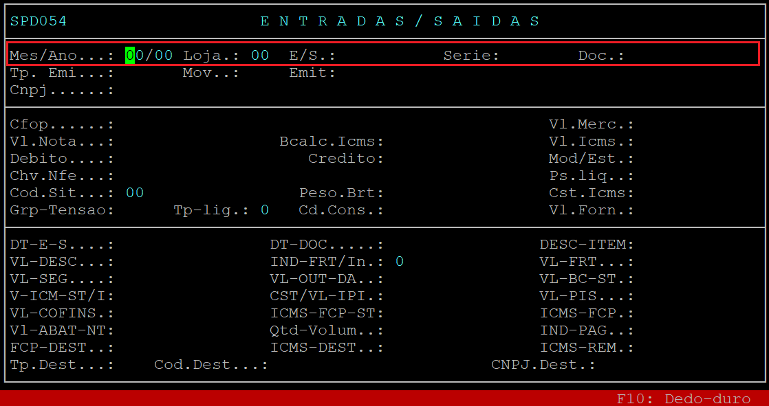 Ao acessar a rotina, informe os dados da nota nos seus respectivos campos, sendo: Mes/Ano o mês (com dois dígitos) e o ano (com dois dígitos) da emissão da nota fiscal, Loja a loja (com dois dígitos) correspondente a nota fiscal, E/S informe E para nota de entrada (correspondente a nota de serviço), Serie a série do documento fiscal ou aperte a tecla Enter para prosseguir, Doc informe o número da nota fiscal e aperte a tecla Page Down para carregar os dados da nota.