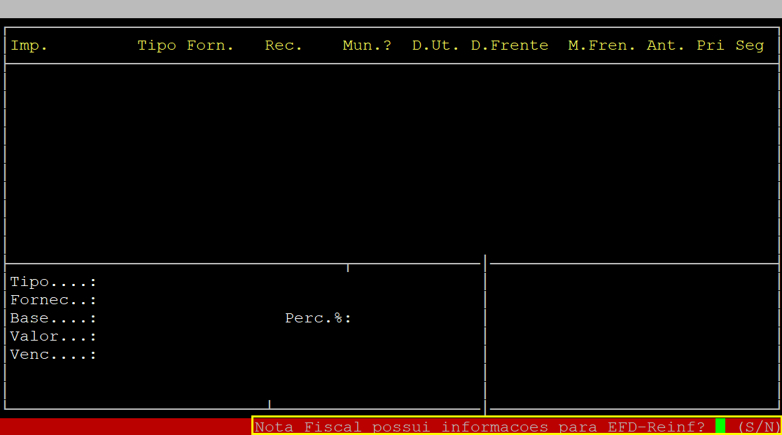 Em sequência, o sistema exibirá a pergunta " Nota Fiscal possui informacoes para EFD-Reinf? ", no qual deverá informar a letra S para sim ou N para não.