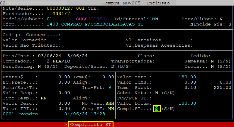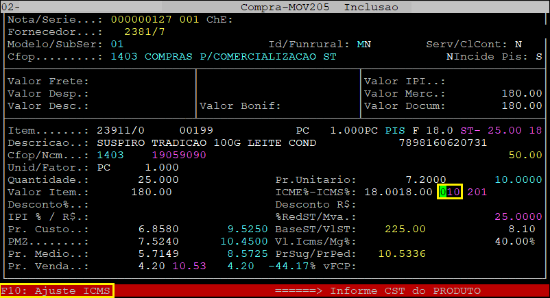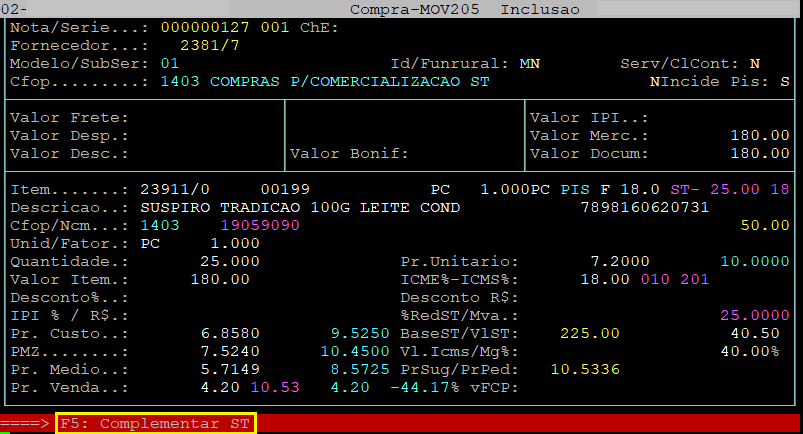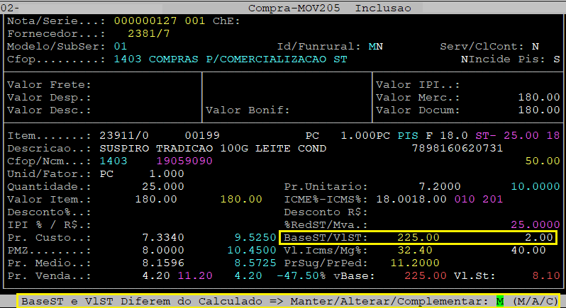 Nesse caso quando os valores de base de cálculo e Icms-ST digitados na capa forem diferentes dos calculados dentro do item, será apresentada a mensagem no rodapé.