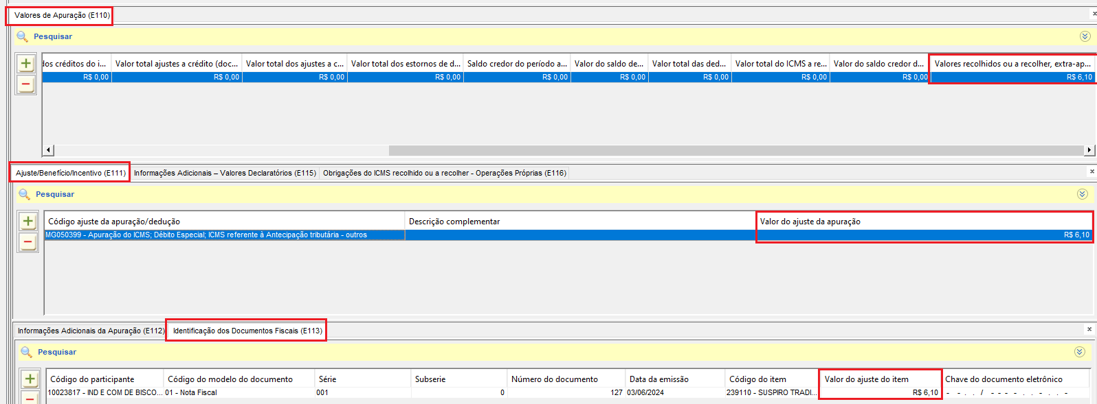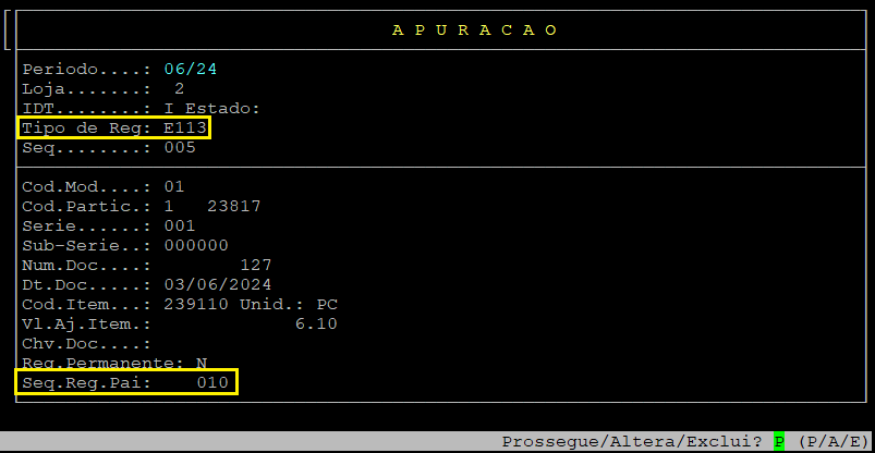 Pelo relatório também é possível visualizar o ajuste do registro E113, o destaque abaixo mostra o sequencial do registro pai, que é o E111.