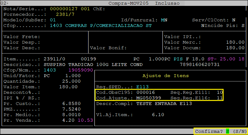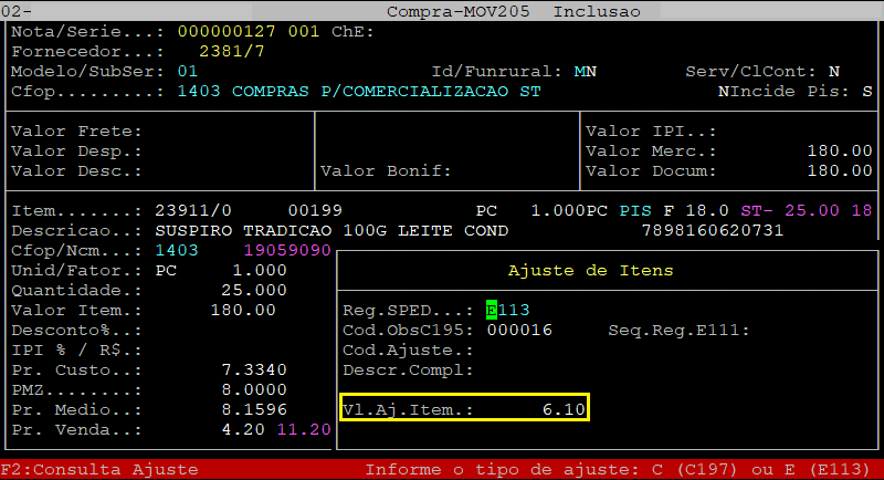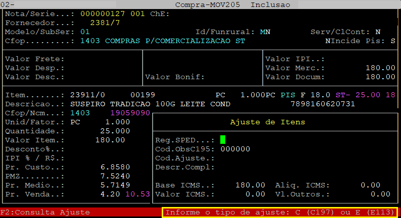 Os dados lançados na entrada compra são gravados no ajuste de itens.