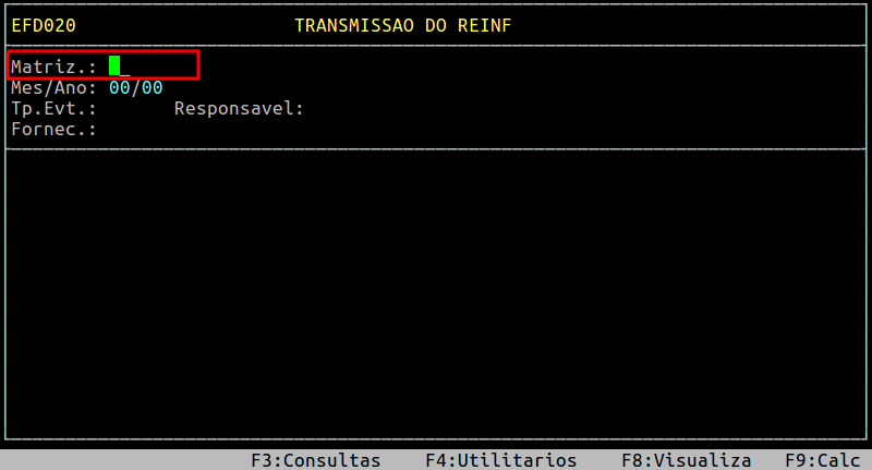 Ao acessar a rotina, no campo Matriz informe a loja matriz, que foi transmitida ao REINF e, pressione a tecla Enter.