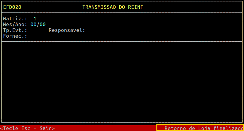 Em seguida o sistema exibirá a mensagem " Retorno de loja finalizado ". Para sair da rotina pressione a tecla Esc.