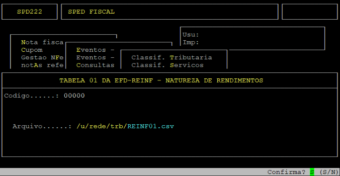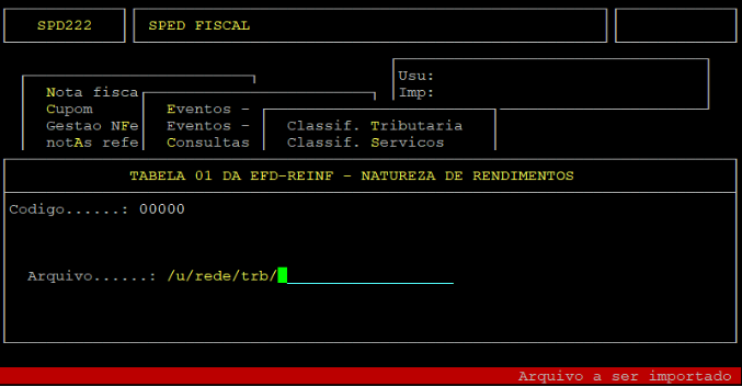 Pré - Condição: Para realizar a importação no Sistema Integral, deverá realizar o download da tabela em Tabela Rendimento Natureza , abrir a tabela e salvar em ´´ponto e vírgula´´ . Em seguida, salvar em formato csv e colocar no diretório /u/rede/trb/. |