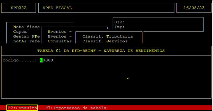Ao término da importação da Tabela, caso deseje consultar os códigos existentes, pressione a tecla F2 - Consulta.