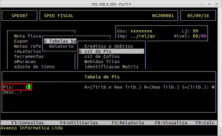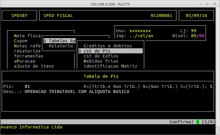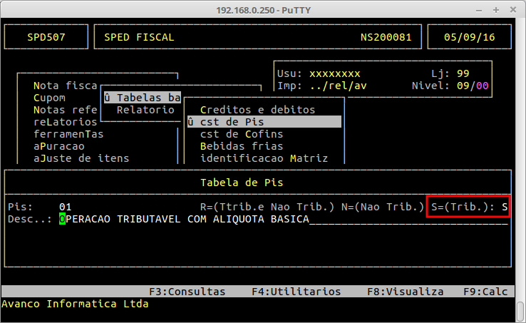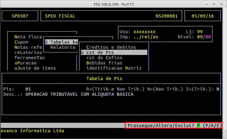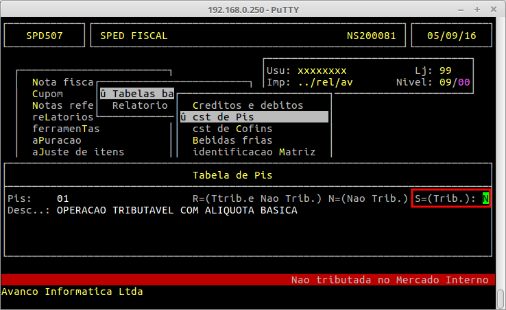 No campo Pis, informe o número de CST, pressione a tecla ENTER, em seguida, pressione a tecla A para alterar e informe S caso ele seja tributável ou N caso não seja tributável.