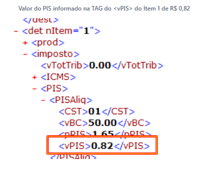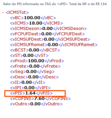 Exemplo: Foi realizada a emissão de uma NF-e com dois itens informados, sendo que somente um item teve o valor do PIS calculado em R$ 0,82 e ao final foi informado no Total do PIS o valor de R$ 1,64. Sendo a soma do Valor do PIS de todos os itens R$ 1,64, a NF-e será rejeitada pelo motivo 602.