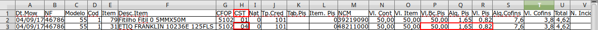 Observe que o Item acima 3/1 ETIQ FRANKLIN está com o código CST 04 (Operação Tributável Monofásica - Revenda Alíquota Zero), mas possui base de cálculo e aliquotas em sua movimentação.