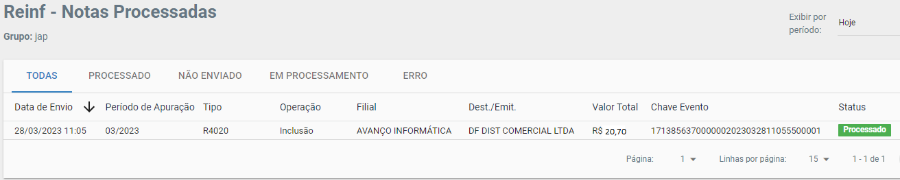 Observações: As notas a serem enviadas serão acumuladas no lote do fornecedor, sendo exibidas na grid por loja. Somente serão exibidos as notas fiscais que no momento da Entrada no Sistema foi identificado que possui informações do REINF. Para mais informações acesse o documento: ´´Dúvida | Como Configurar Evento R4020 Nota Fiscal Serviços Tomados REINF Integral?". Nesse evento o valor apresentado é referente a soma dos impostos, e não ao valor contábil da nota. |