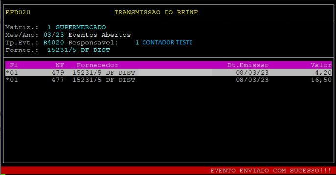 Ao pressionar Enter será retornado para a tela de Envio do Registro R-4020, que estará com o Status de Enviado, ou seja, o campo "ST" (Status) com a descrição "E" (Enviado).