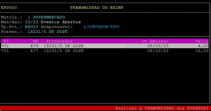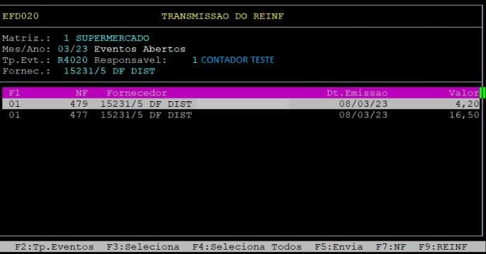 No campo "Tp.Reg" digite R4020 ou pressione F2 para verificar as opções e em seguida digite o Fornecedor, existe também a opção F5 no rodapé, onde mostra as notas não enviadas referente ao Evento R-4020.