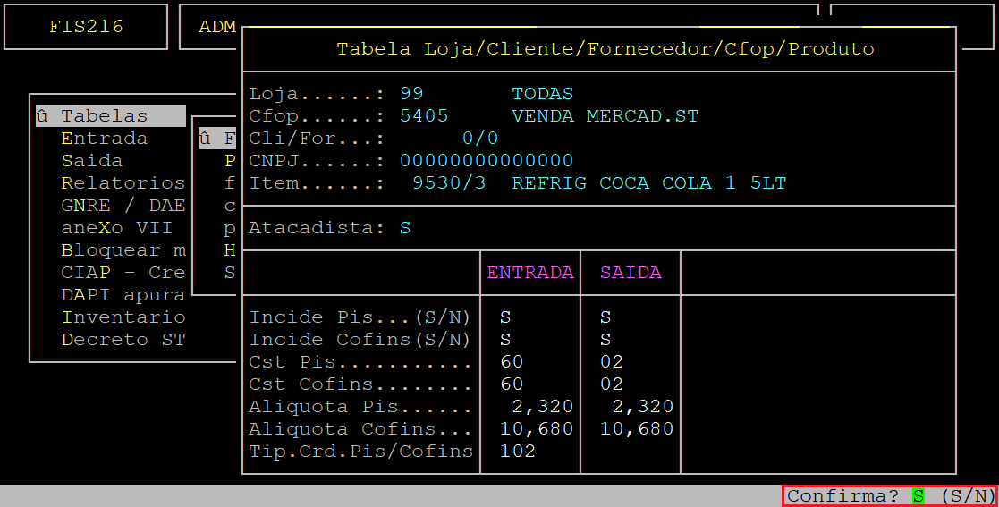 Assim que preencher os campos citados no quadro acima, o sistema exibirá a pergunta " Confirma? ", no qual deverá pressionar a tecla Enter ou informar a letra S para confirmar.