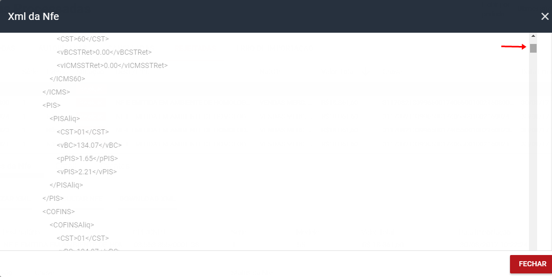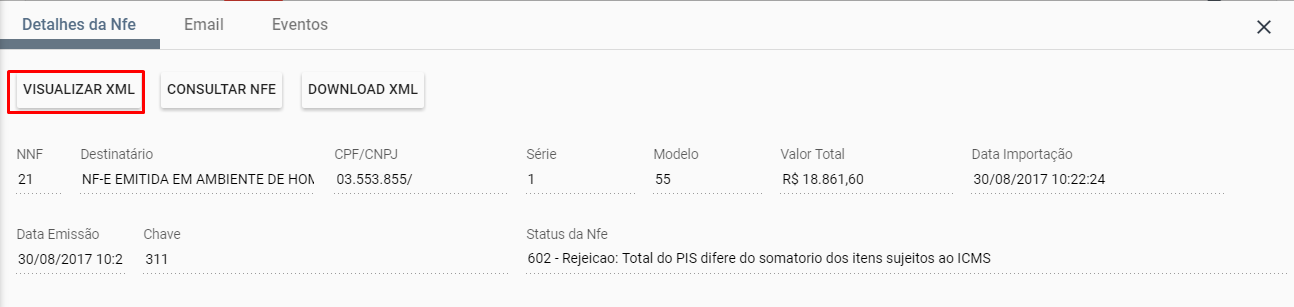 A seguir serão exibidos as abas com os detalhes da nota fiscal, como pode ser observado na parte inferior da tela, então clique na opção Visualizar XML.