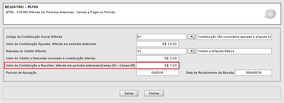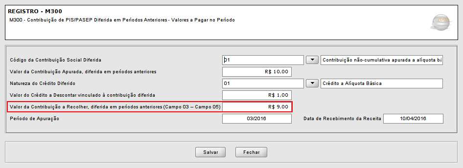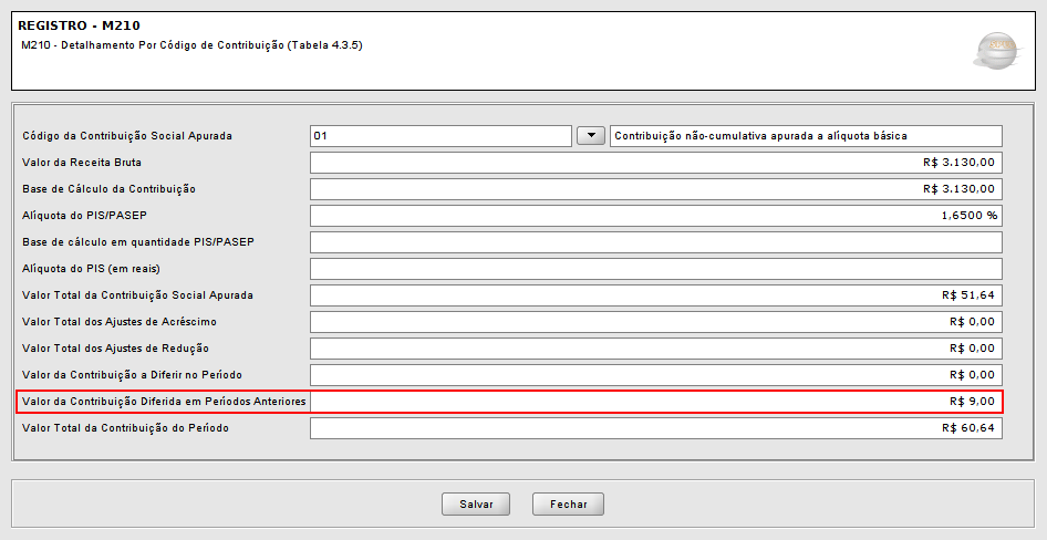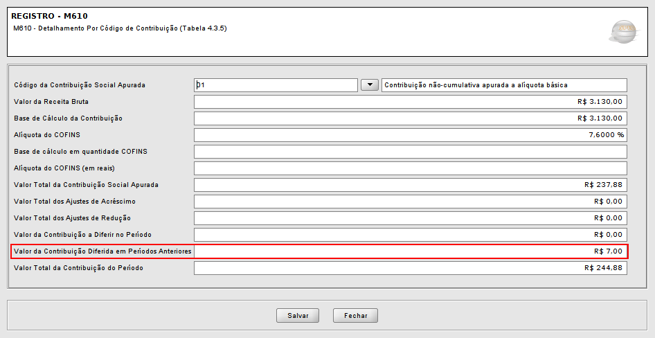 Vl. contr. diferida: | Informe o Valor da Contribuição Apurada Diferida em períodos anteriores. |