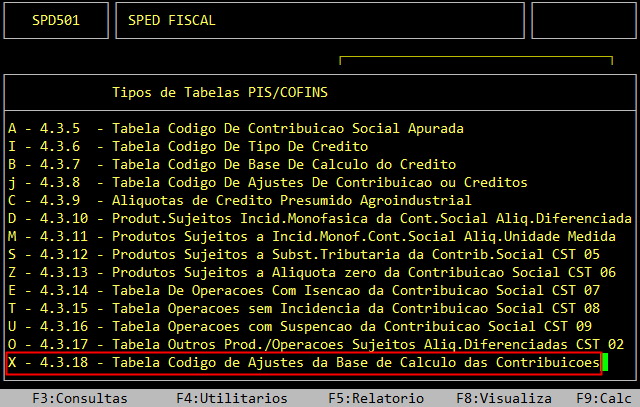 Localização: | Sped - Efd / Sped Pis-Cofins / Tabelas Basicas / Creditos e Debitos |