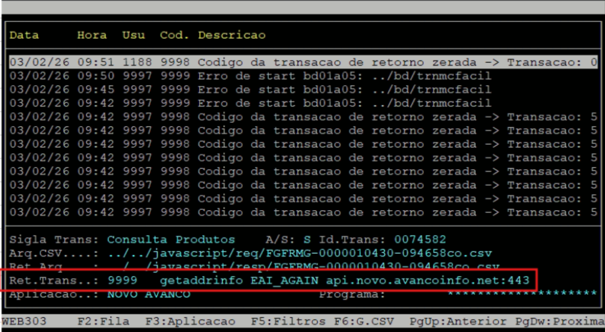 Tela de erro: Retorno de Transação: 9999 getaddrinfo EAI_AGAIN api.novo.avancoinfo.net:443