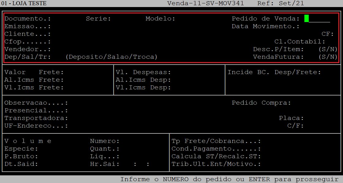 | Pedido de Venda: | Informe o número do pedido de venda e, aperte a tecla Enter para prosseguir. Caso contrário deixe o campo sem preenchimento e, aperte a tecla Enter para prosseguir. |