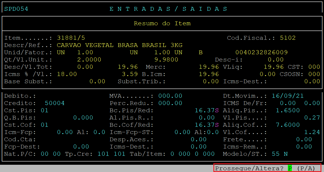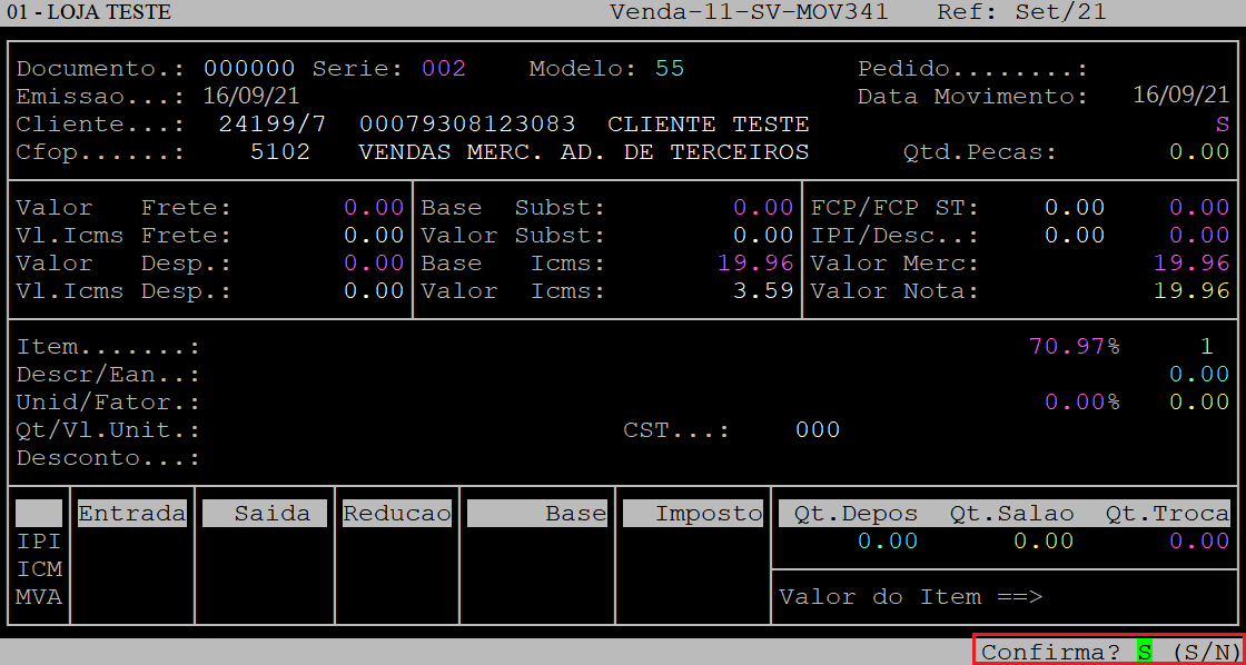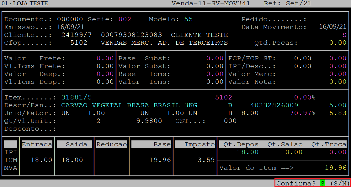 Ao ser exibida a pergunta " Confirma? ", aperte a tecla Enter ou informe a letra S para confirmar os dados do item.