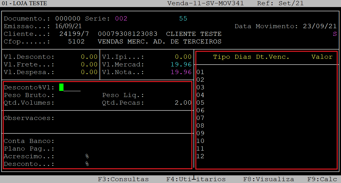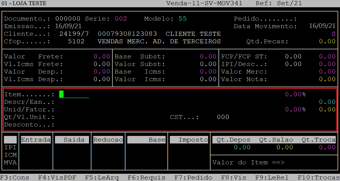 | Vendedor: | Informe o código do vendedor responsável pela venda (com três dígitos, podendo inserir zeros à esquerda), que esteja cadastrado no sistema. |