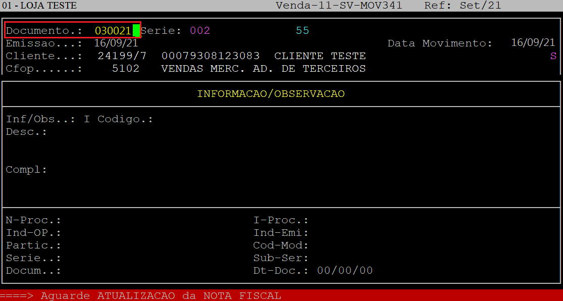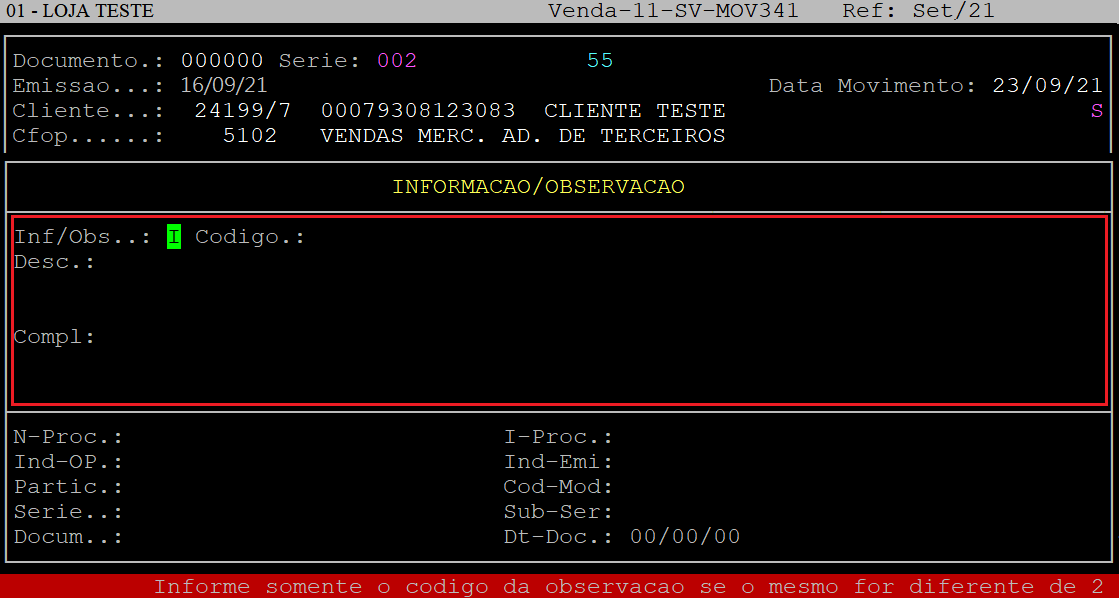 | Observação: | Informe uma observação para a nota fiscal e, aperte a tecla Enter para prosseguir. Caso contrário deixe o campo sem preenchimento e, aperte a tecla Enter para prosseguir. | |
