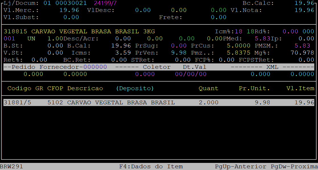 | Peso Liq: | Informe o peso líquido da mercadoria, se desejar e, aperte a tecla Enter. |