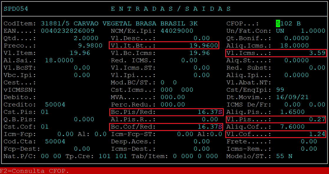 | Desp.NInc: | Refere-se ao valor de não incidente do produto. |