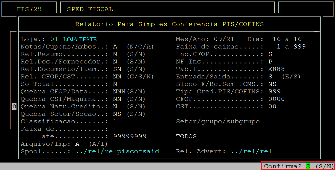 Após informar os dados citados no quadro acima, o sistema exibirá a pergunta " Confirma? ", no qual deverá apertar a tecla Enter ou S para confirmar e gerar o relatório.